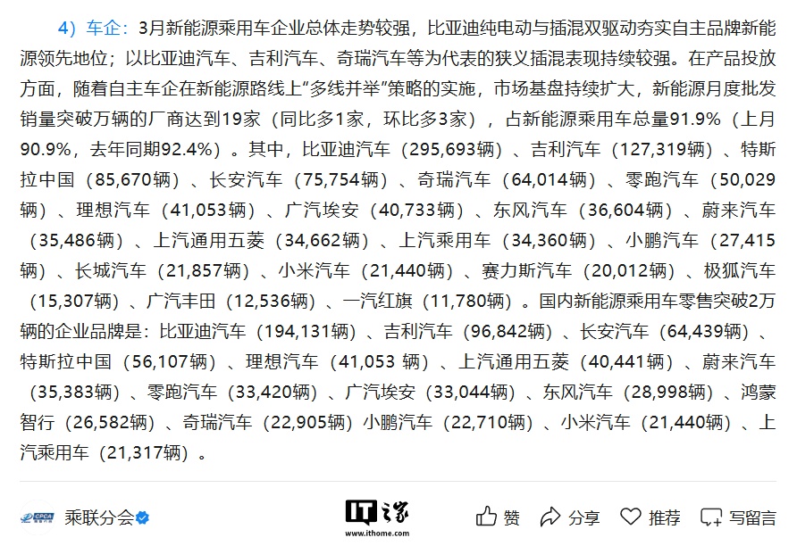 比亚迪汽车(295,693 辆)祯祥汽车(127,319 辆)特斯拉中国:85,670 辆长安汽车:75,754 辆奇瑞汽车:64,014 辆零跑汽车:50,029 辆理思汽车:41,053 辆广汽埃安:40,733 辆东风汽车:36,604 辆蔚来汽车:35,486 辆上汽通用五菱:34,662 辆上汽乘用车:34,360 辆小鹏汽车:27,415 辆长城汽车:21,857 辆小米汽车:21,440 辆赛力斯汽车:20,012 辆极狐汽车:15,307 辆广汽丰田:12,536 辆一汽红旗:11,780 辆IT之家审视到,乘联分会还公布了国内新动力乘用车零卖龙套 2 万辆的企业品牌,其中提到鸿蒙智行销量为 26,582 辆。具体情况如下: