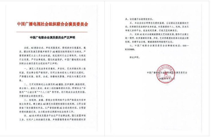 中国播送电视社会组织吞并会演员委员会于 4 月 2 日发布严正声明,历害责问 AI 换脸、素材奢华及违纪检修 AI 模子等步履,发出行业劝诫:严称职律底线,捍卫视听委果。
