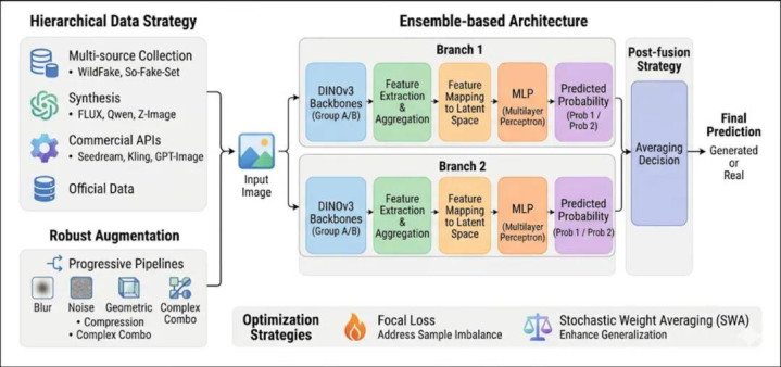 为了支吾上述挑战,蚂蚁安全团队建议了一种基于 DINOv3 视觉基础模子的鲁棒集成检测框架。