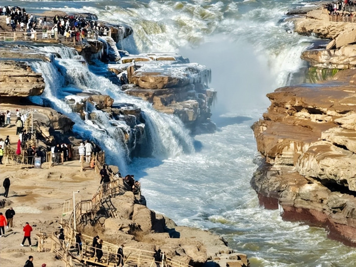 特质:黄河在此收窄如壶口,烟雾弥散,变成水底冒烟、霓虹戏水等奇不雅。冬季冰封为 “冰瀑玉壶”。