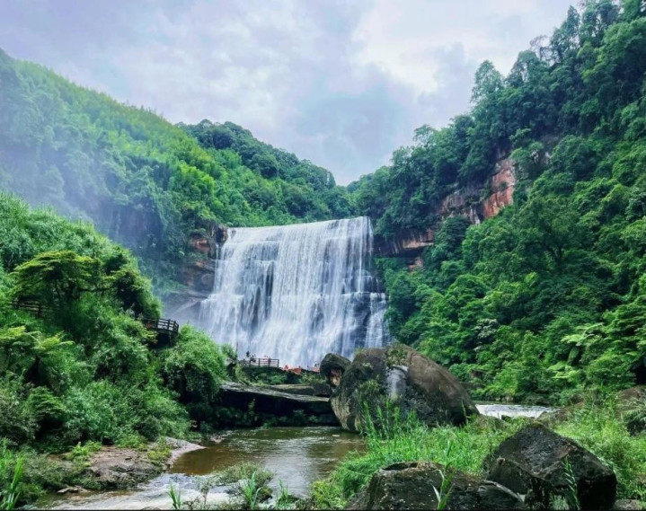 特质:位于丹霞地貌区,红岩飞瀑,阵容恢宏,可与黄果树比好意思。
