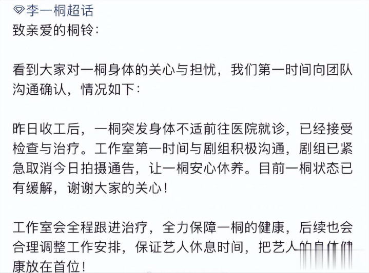 著作败露,李一桐是收工后突发不适去病院,照旧作念完搜检和诊疗,剧组第一时辰取消了她今日总计拍摄,让她宽心疗养,目下状态照旧缓解。