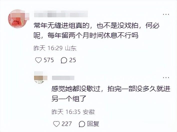 还有网友喊话剧组,别再把熬大夜当常态,别把演员的敬业当成无穷透支的原理。