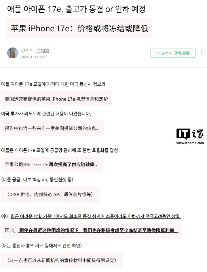 IT之家1月24日消息,消息源yeux1122昨日(1月23日)发布博文,爆料称尽管NAND闪存和DRAM内存成本飙升导致高端机型面临涨价压力,但iPhone17e售价不仅有望与iPhone16e持平(国行售价4499元起),甚至可能出现下调。