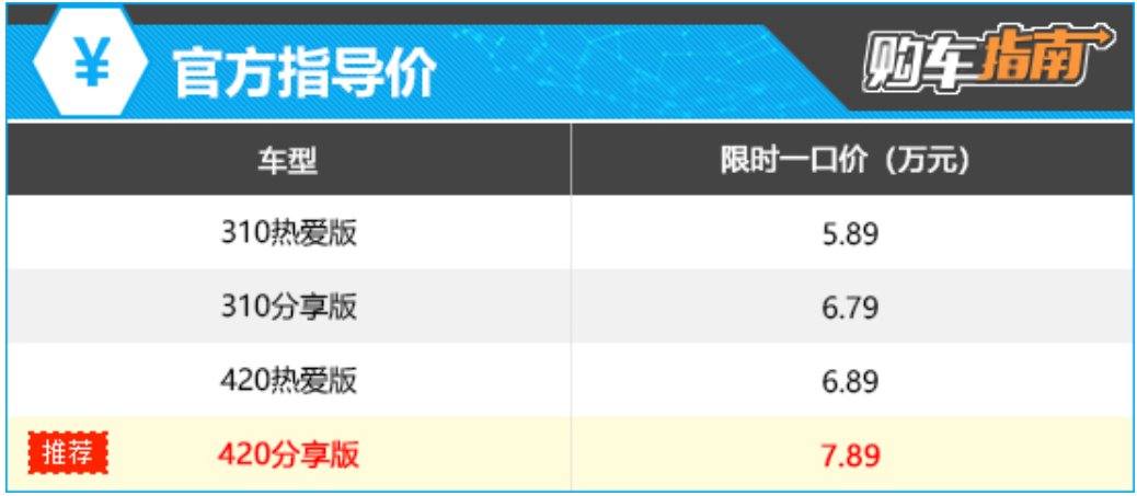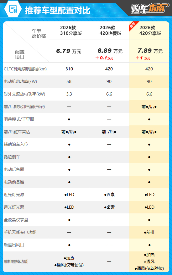 在现在在售的4款车型中,咱们推选7.89万元的420共享版。行为顶配车型,其在续航里程、建立水普通面有不俗发达且价钱也莫得跳动许多。推选车型较低一级别车型的主要变化在于欢欣肠、驾驶操控和安全建立方面的擢升,如多出后座出风口、前/后排头部气囊(气帘)和循迹倒车等。用车体验取得彰着擢升的同期,售价却仅加多1万元,性价比拟高。
