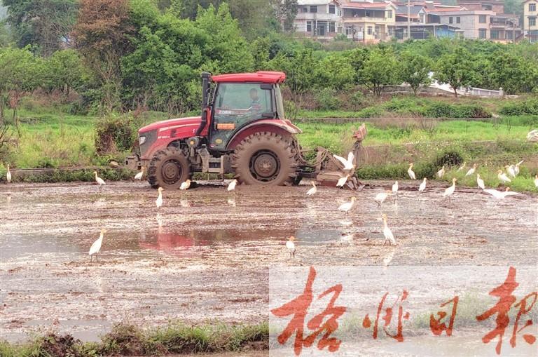 4月9日,在蒙山县西河镇水秀村高表率农田食粮汲引基地,一群白鹭在刚刚翻耕的田间满足觅食。