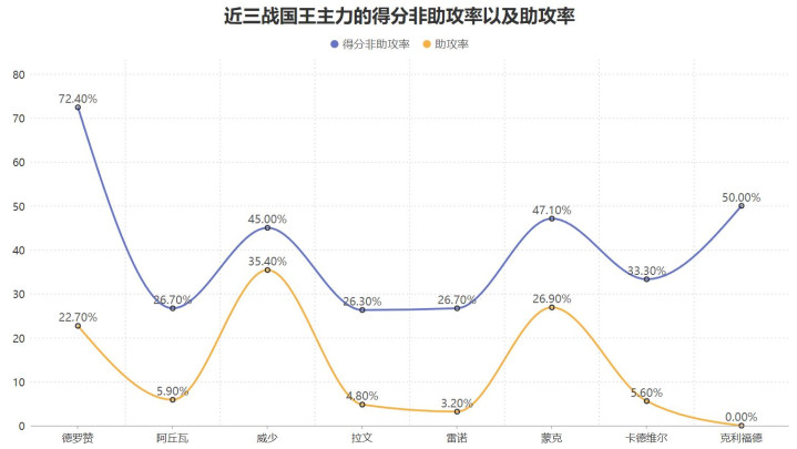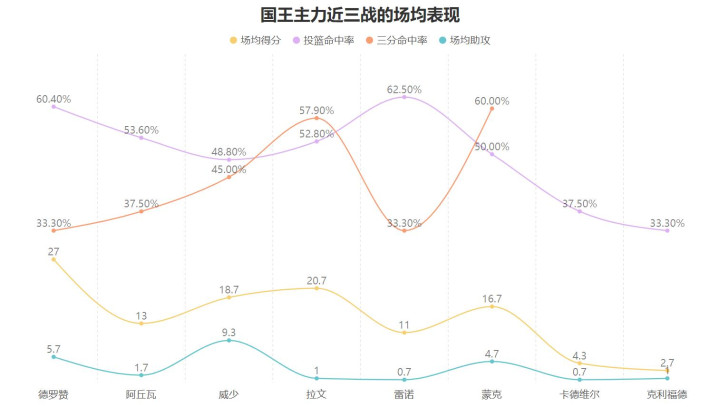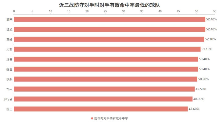 近三战国王防守对手时,对手的运动战也就是结合三分情况的有效命中率仅有47.6%,这个防守时限制对手命中率的效果位于联盟最强,当国王能把球命中时会激发球员们的积极性更加卖力的防守,同时也可以令对手难以打出攻防转换的得分机会,由进攻带动防守是国王近三战强势的关键。