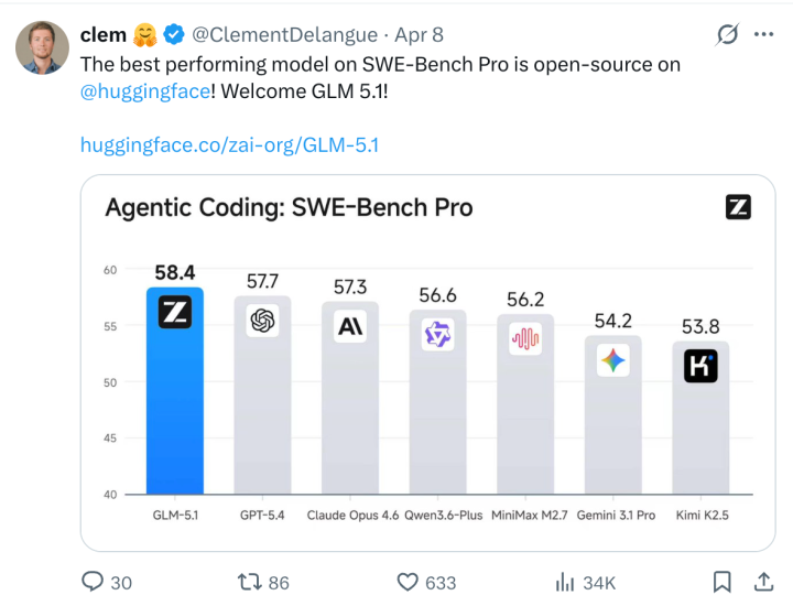 在智谱开源发布GLM-5.1模子12小时之后,智谱在X上的官方推文有370万阅读。HuggingFace的CEOClementDelangue公开转发道贺:“SWE-BenchPro上发扬最佳的模子当今在HuggingFace上开源了。”