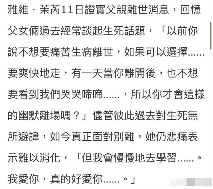 雅维·茉芮在外交平台悲悼发文吊问父亲:“家父已于近日淘气离世,咱们正奉陪他走完终末一程。恳辞奠仪,若想抒发情意,可赠花篮。”她还自大,父亲生前曾与她安心聊过存一火,顶住她“要清凉地走,不想看到你们哭哭啼啼”,这份“幽默离场”的遗志,更让粉丝疼爱不已。