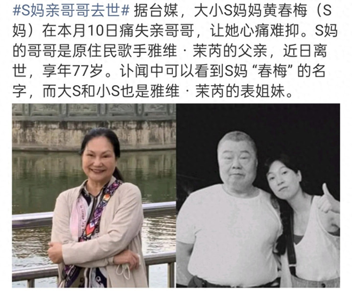 4月14日,大小S家眷再度传悲讯,让多量粉丝揪心不已——S妈黄春梅在送别爱女大S徐熙媛一周年之际,又碰到近亲离世的打击,77岁的亲哥哥因病淘气离世。这位曾与S妈相伴半生、见证大小S成长的近亲离去,让本就千里浸在悲伤中的S妈再度崩溃,而哥哥的真实身份也随之曝光,激勉全网热议。