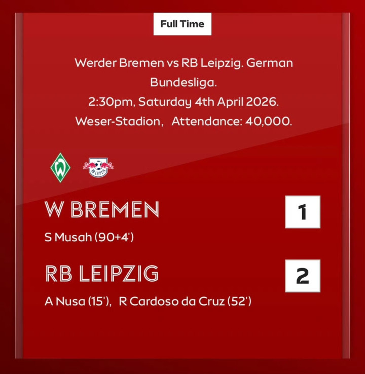 云达不莱梅 1-2 RB莱比锡