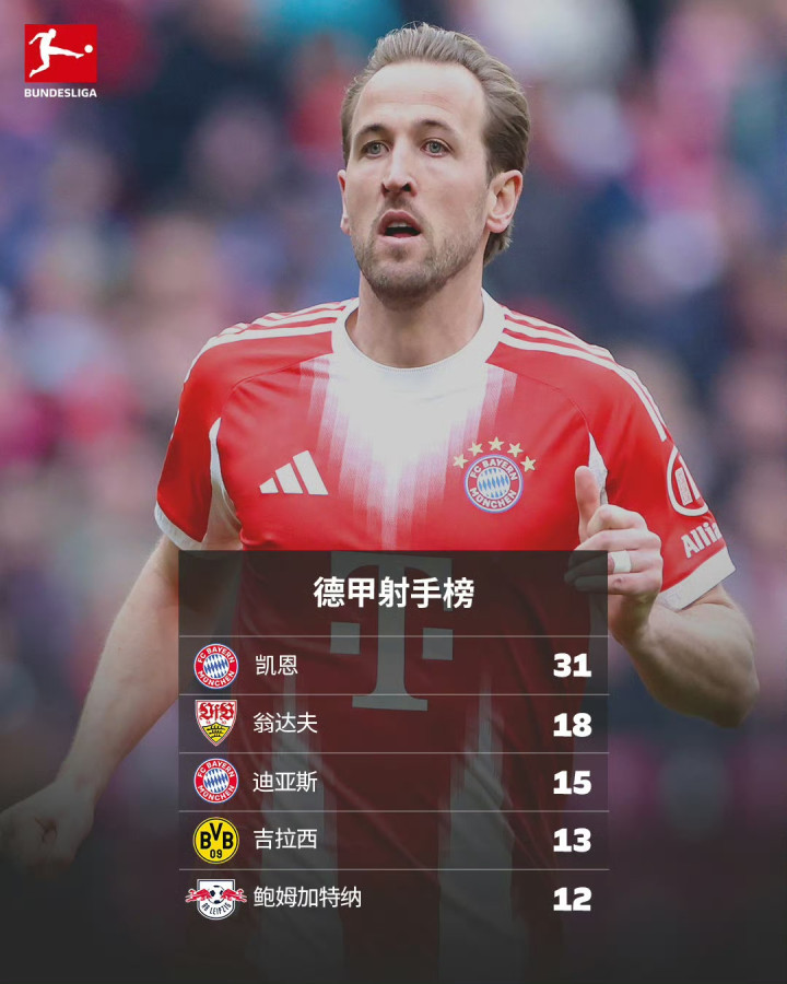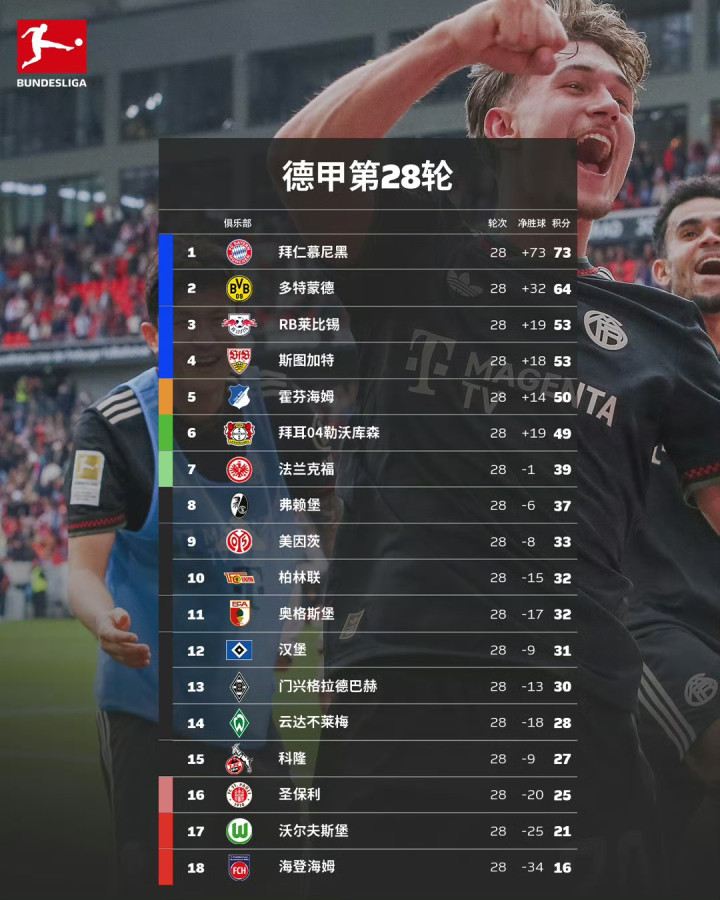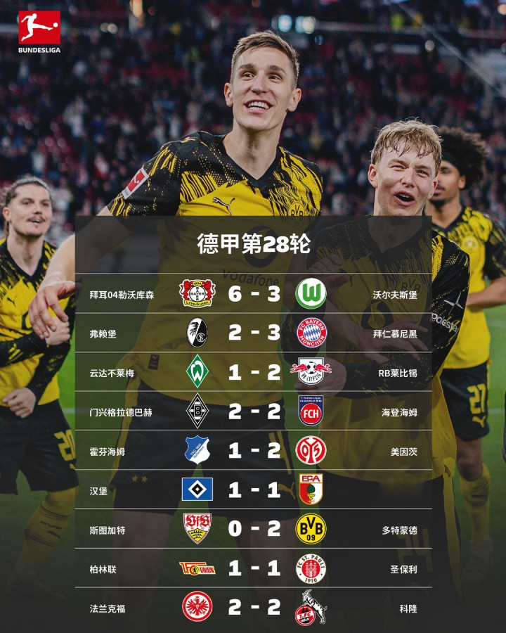 凭借比朔夫、卡尔补时连进2球,拜仁让二追三打败弗赖堡,同期本赛季联赛进球也达到百球大关;多特蒙德客场2比0笑傲与斯图加特的强强对话,与拜仁的分差依然守护在9分,而输球的斯图加特则是被本轮2比1击退云达不莱梅的莱比锡反超排行;联赛第五的霍芬海姆主场1比2负于好意思因茨,死后的勒沃库森顺势以一场6比3狼堡的大捷将分差削弱至1分。