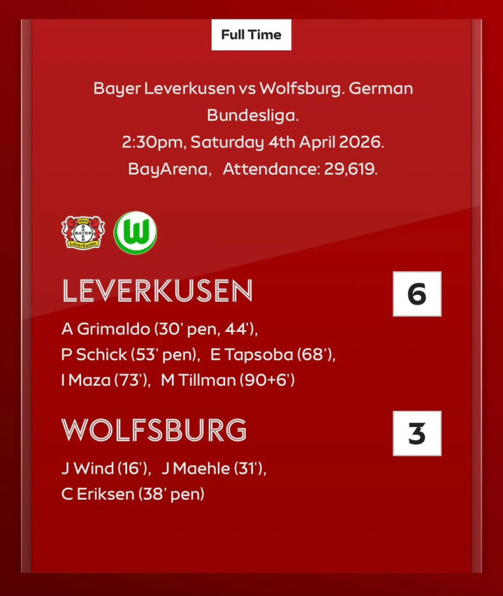 拜耳04勒沃库森 6-3 沃尔夫斯堡