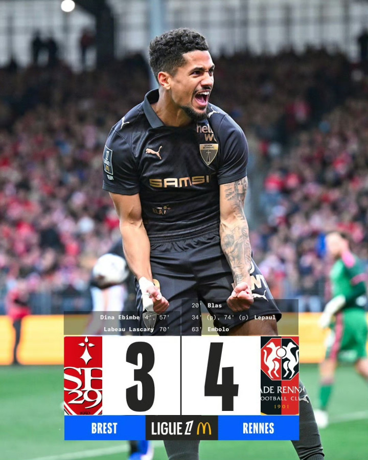 第63分钟,恩博洛破门,布雷斯特2-3逾期雷恩。