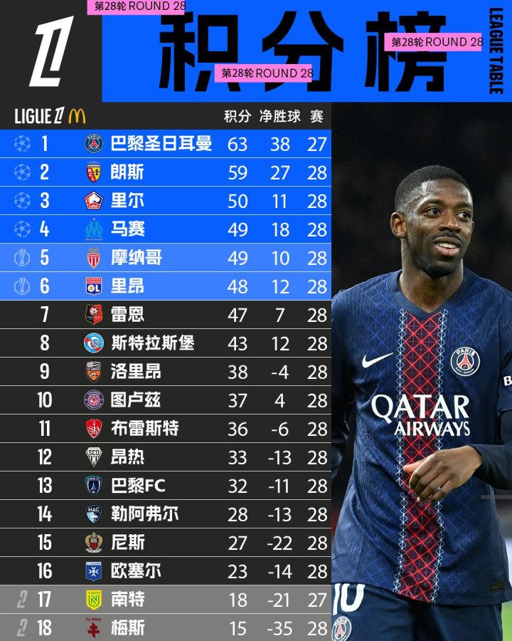 积分榜方面,少赛一轮的巴黎圣日耳曼以63分领跑积分榜,朗斯、里尔和马赛分居第二、三、四位,南特和梅斯暂时位于左迁区。