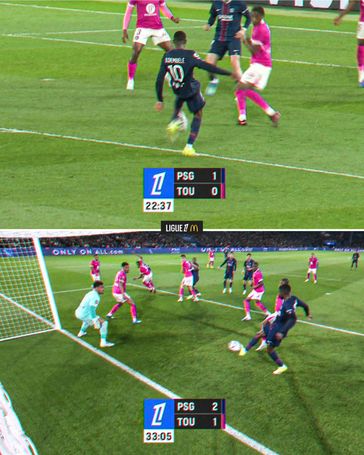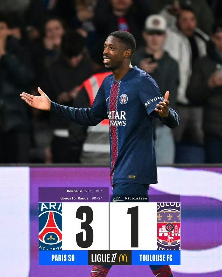 第23分钟,登贝莱原地凌空抽射破门,巴黎圣日耳曼1-0跨越图卢兹。
