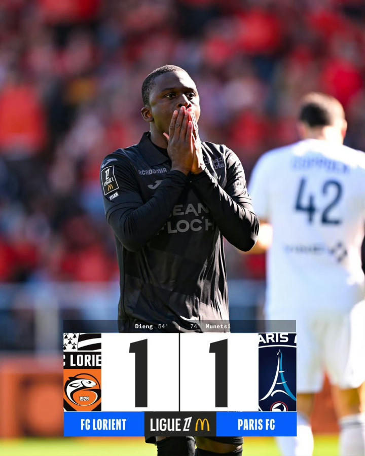 第74分钟,穆内西破门,洛里昂1-1战平巴黎FC。