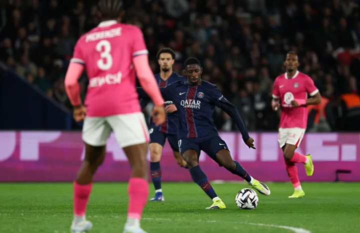 第33分钟,克瓦拉茨赫利亚头球摆渡,登贝莱门前得分,巴黎圣日耳曼2-1跨越图卢兹。